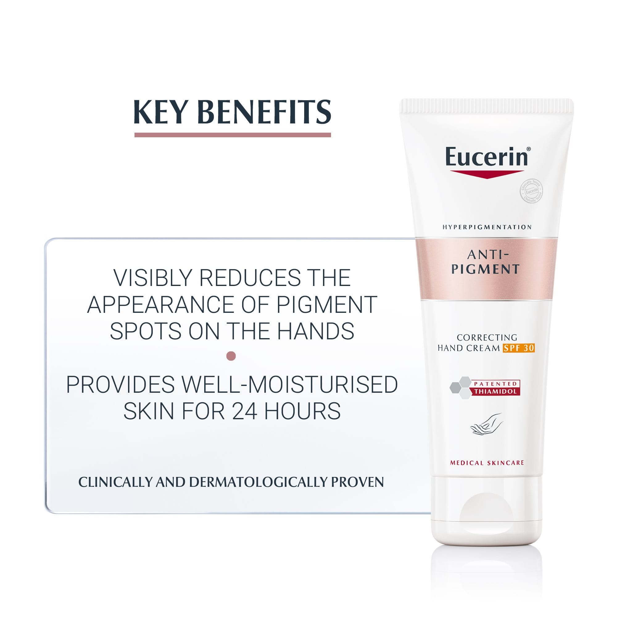 A quickly absorbed anti-pigment correcting hand cream containing patented Thiamidol to reduce the appearance of pigment spots and prevent reappearance with regular usage. Hand cream absorbs quickly and moisturises for 24 hours. SPF 30 provides additional protection from future sun-induced age spots. Maximum four applications per day.